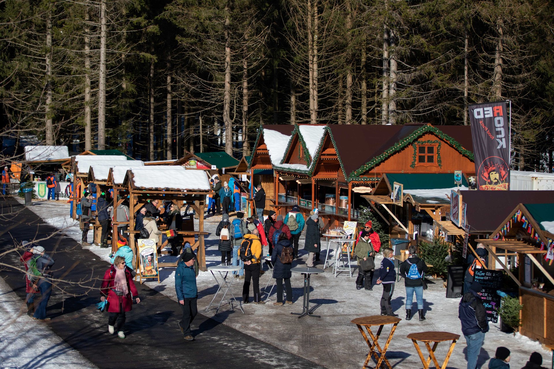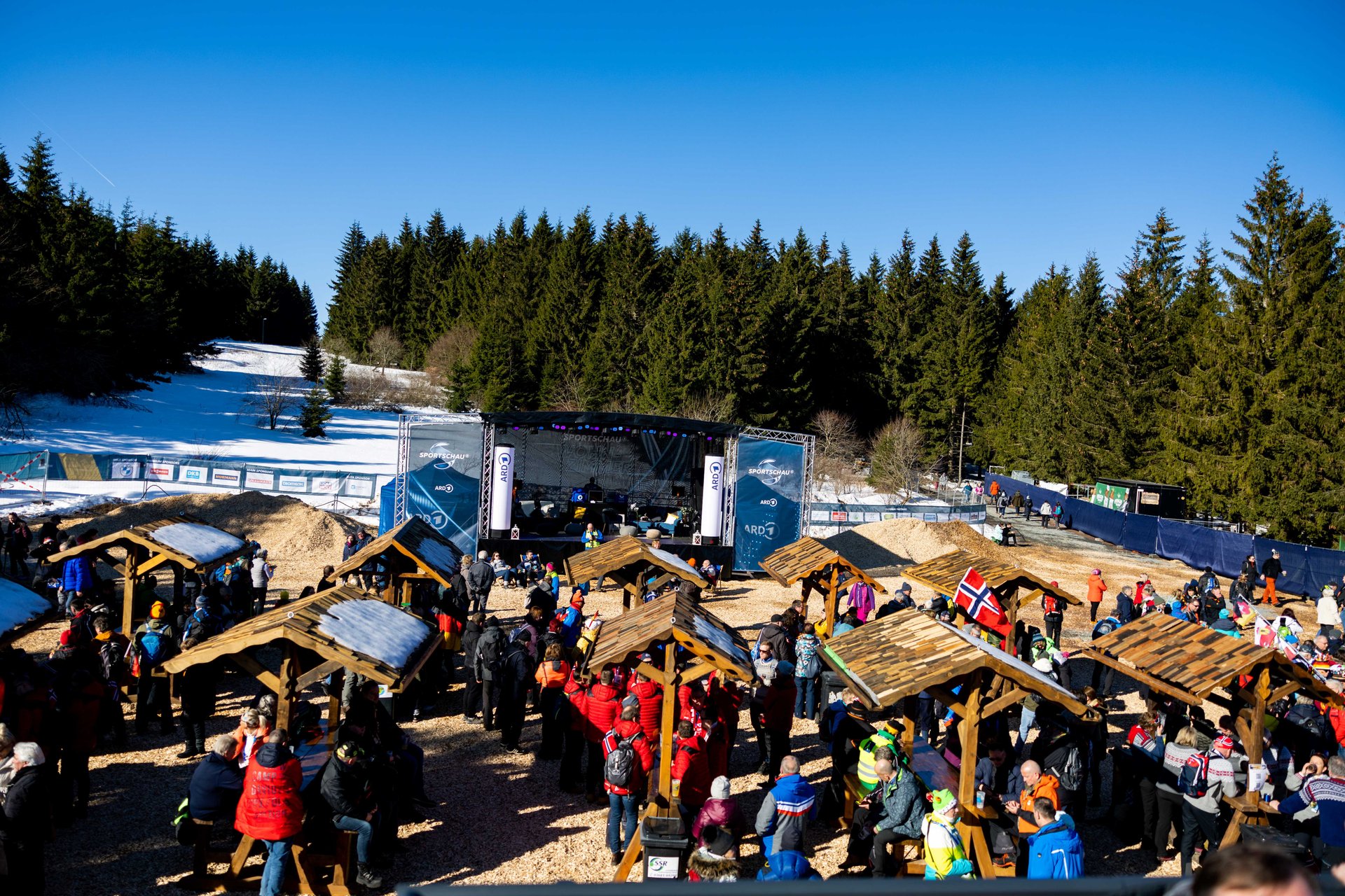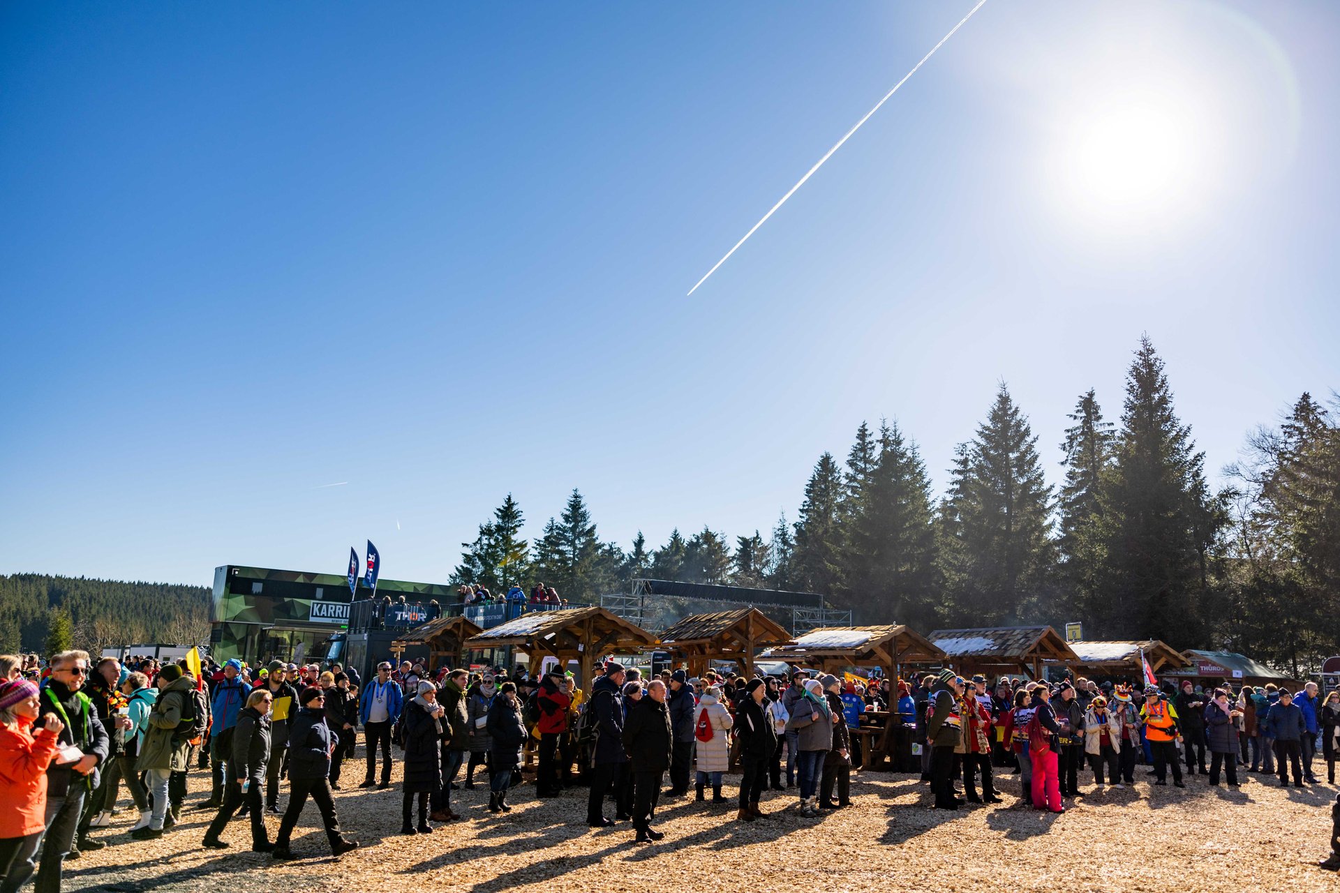 Need some refreshments before the races - whether it's a Thuringian bratwurst or a delicious vegetarian dish, a hot tea or something sweet? You'll find all this in the hut village at the Grenzadler - above the ARENA am Rennsteig - right by the entrance. You can also stock up on fan merchandise and regional souvenirs here. There is also plenty of fun to be had. Feel free to drop by. On the stage in the hut village, various program items accompanied by a presenter provide varied entertainment. There is something for every taste - from sporting to musical or other artistic performances.