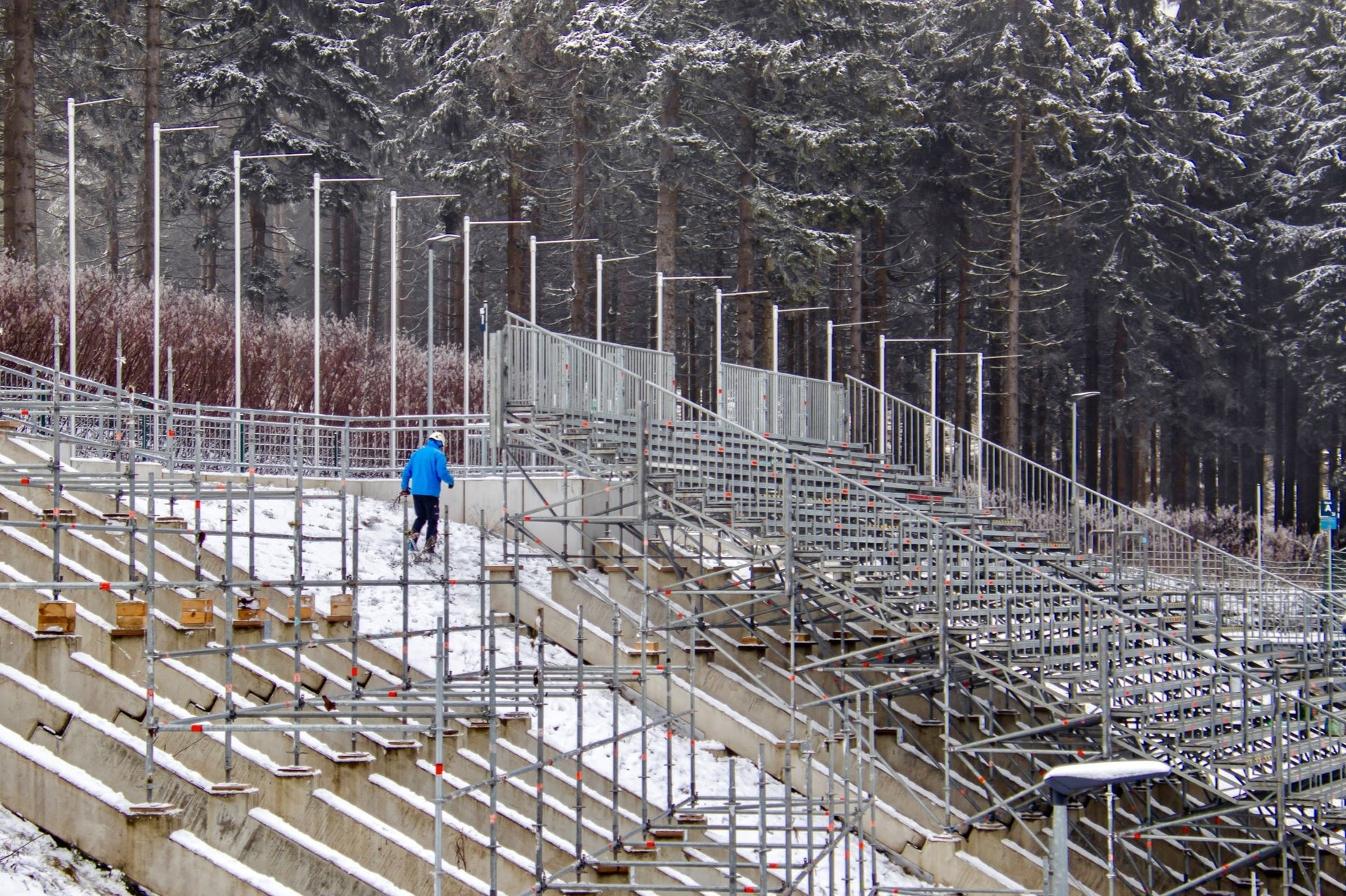 The work is on schedule. The team area with 70 containers in the area of the caravan site, where the athletes can change and retire and the technicians can prepare the skis for upcoming competitions, is as good as finished. Most of the nine video screens in the ARENA and along the course are also up and running, video screen in the Hüttendorf is still to follow. The mobile grandstands, on which thousands of fans to cheer on the athletes, were taken down last Monday.
