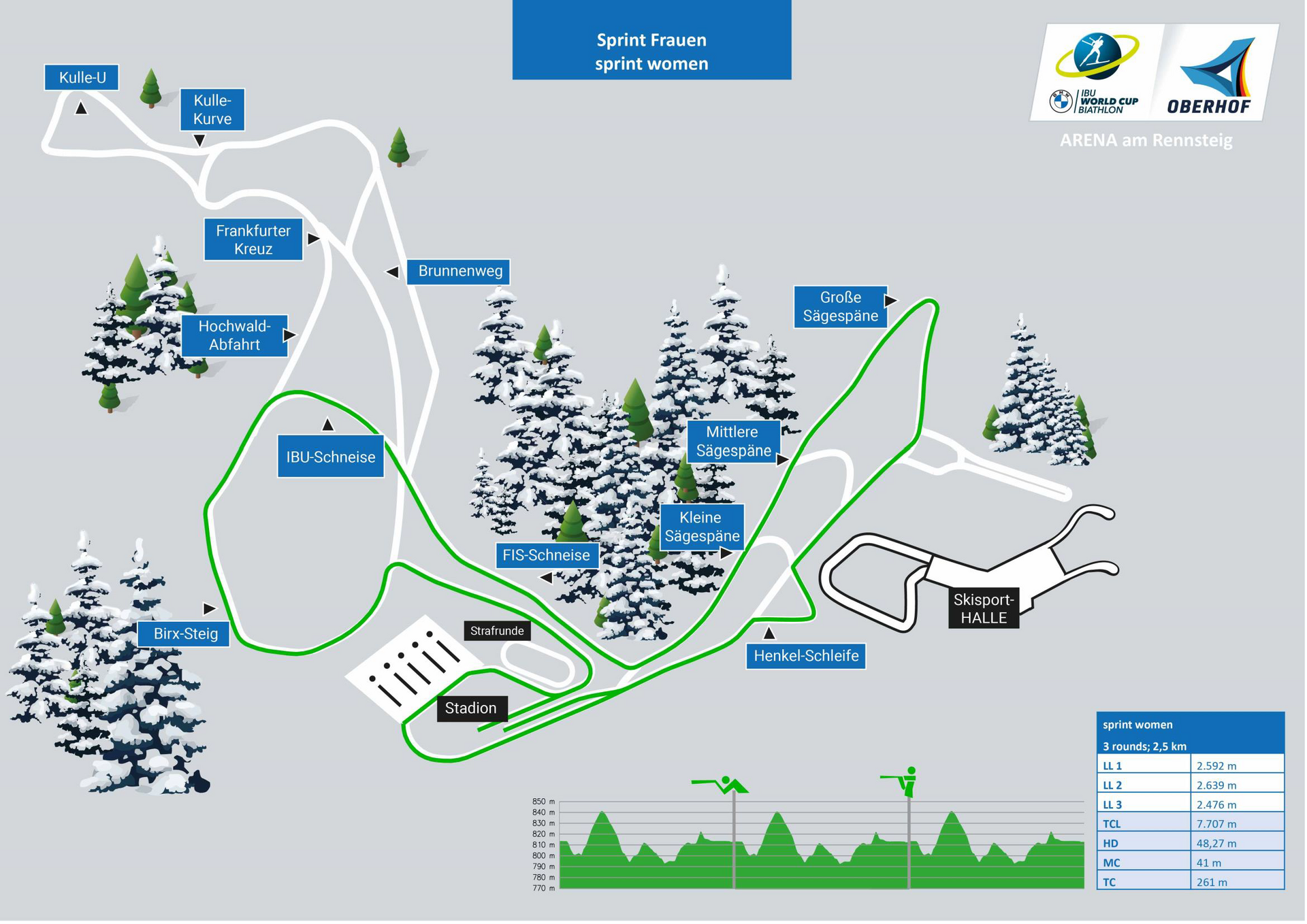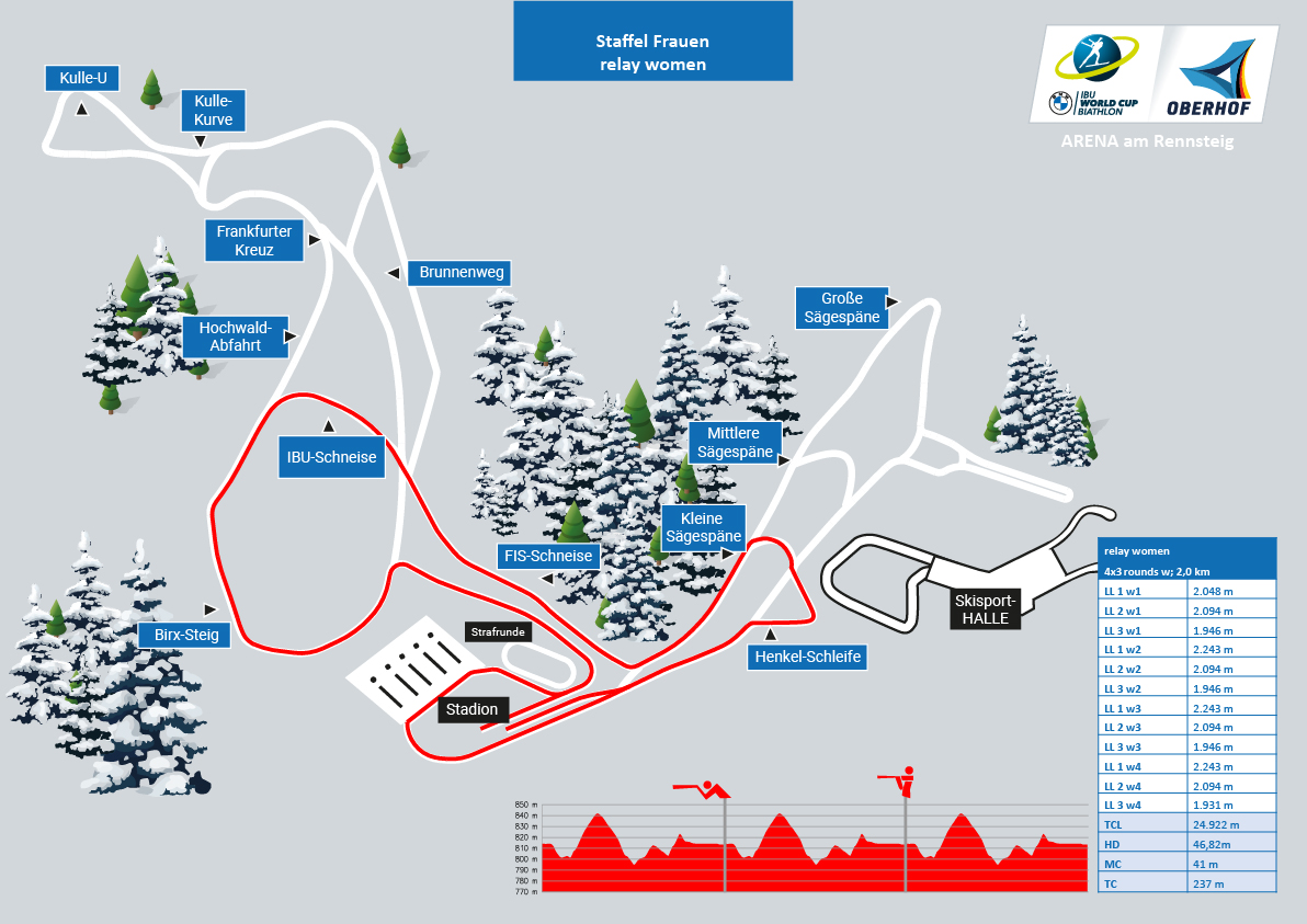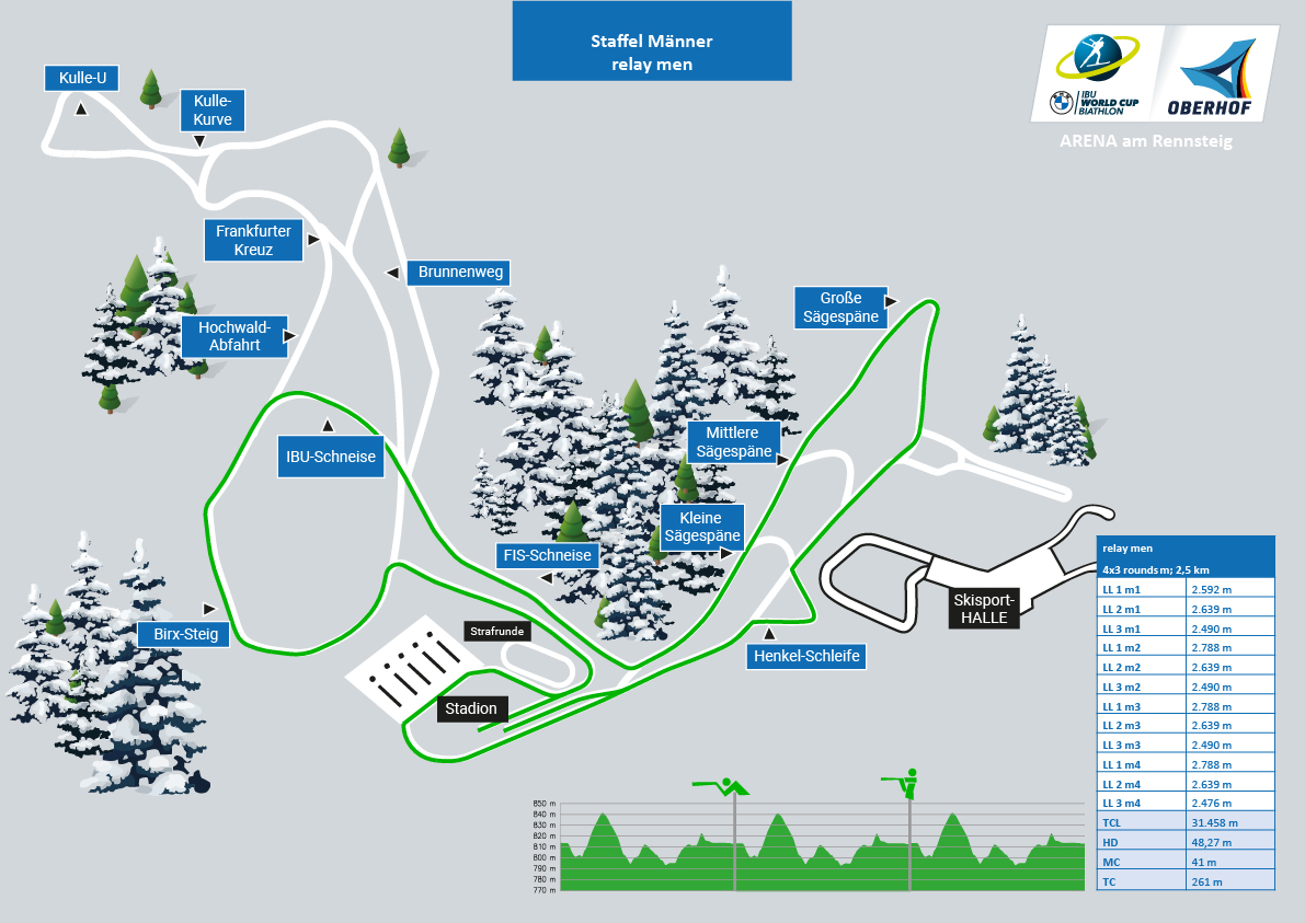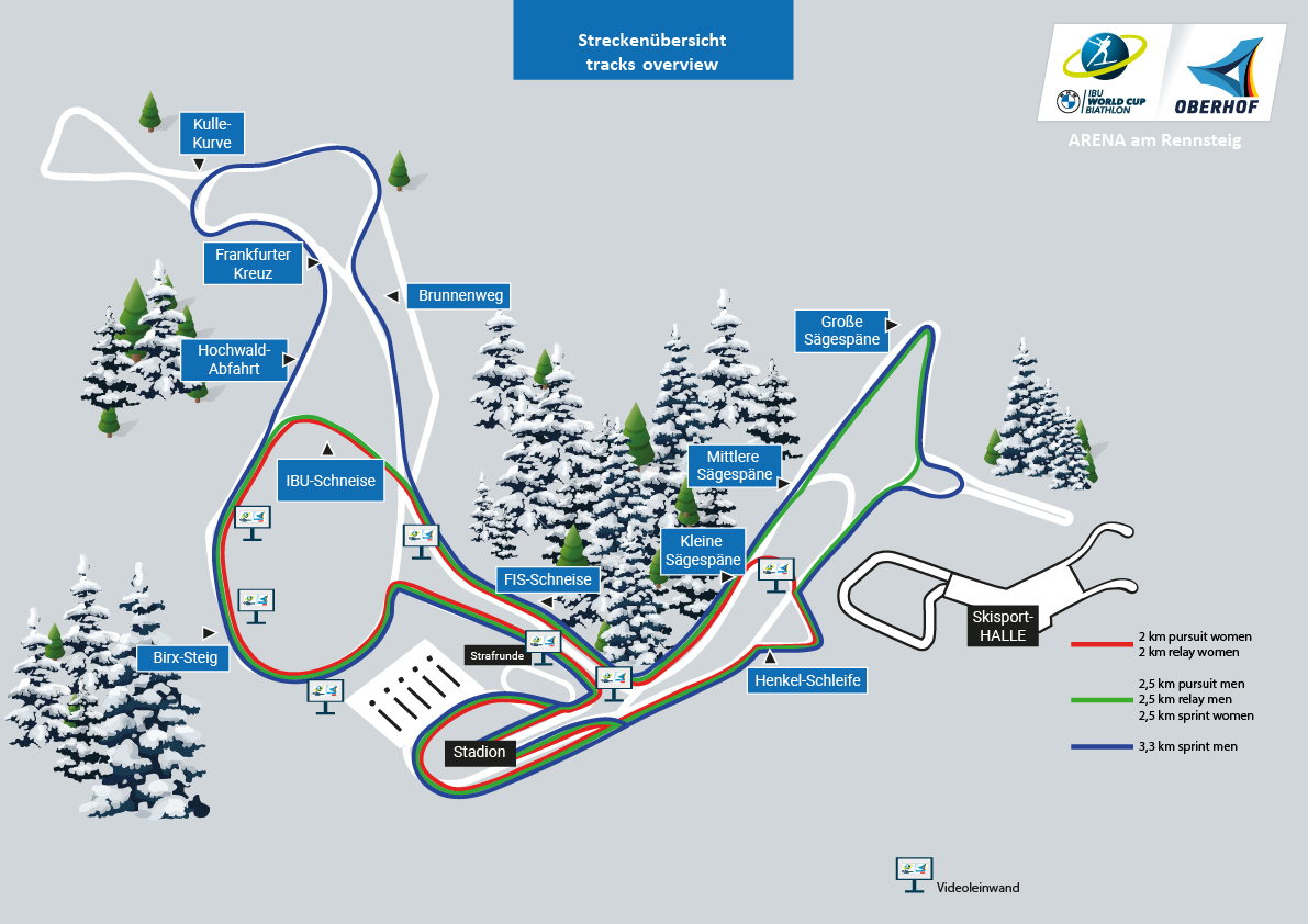 The courses at the BMW IBU World Cup Biathlon 2026 in Oberhof are between 2 km and 3.3 km long. You can find out which routes the athletes run to the disciplines sprint, pursuit and relay in the overview as well as in the following track overviews.