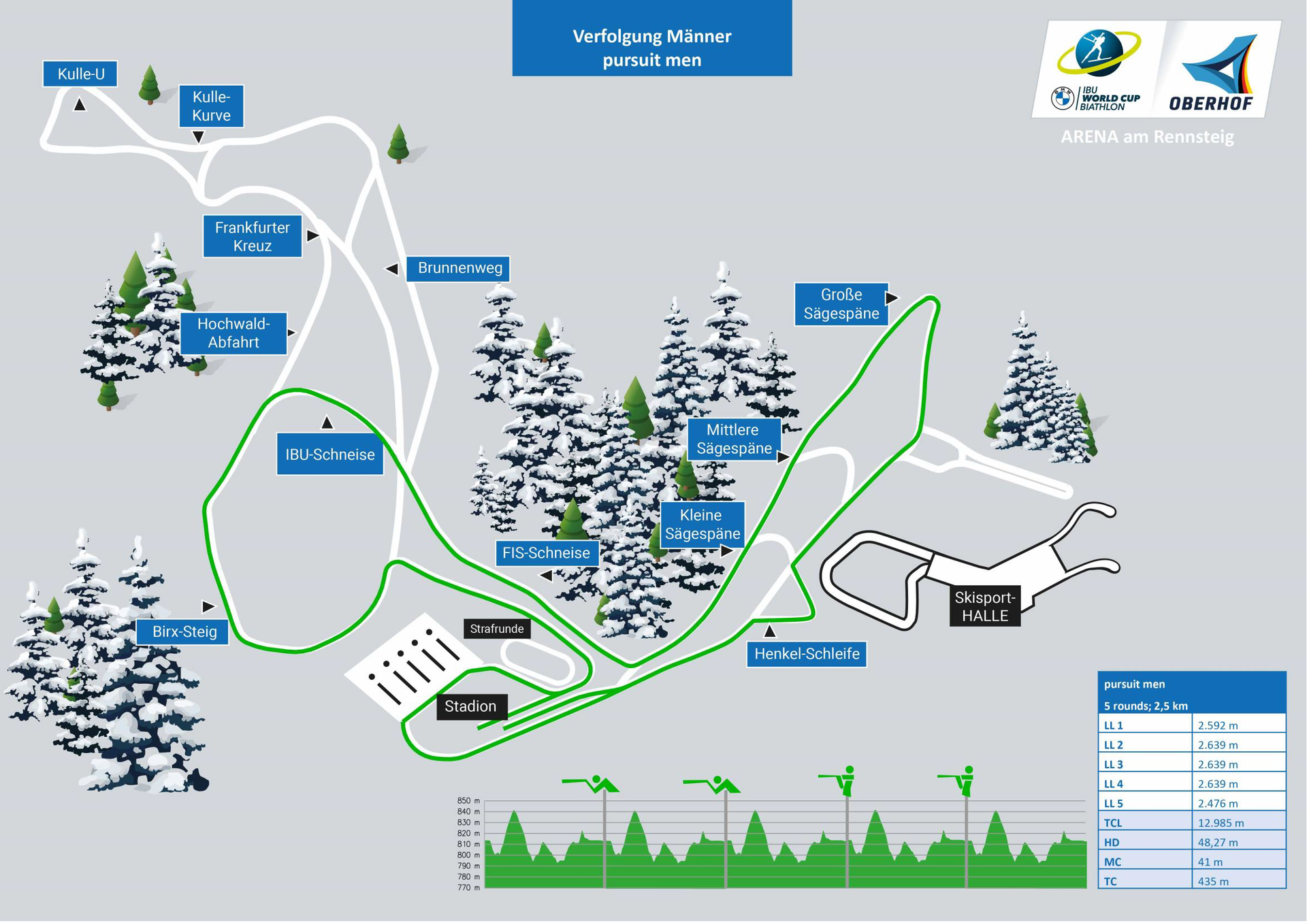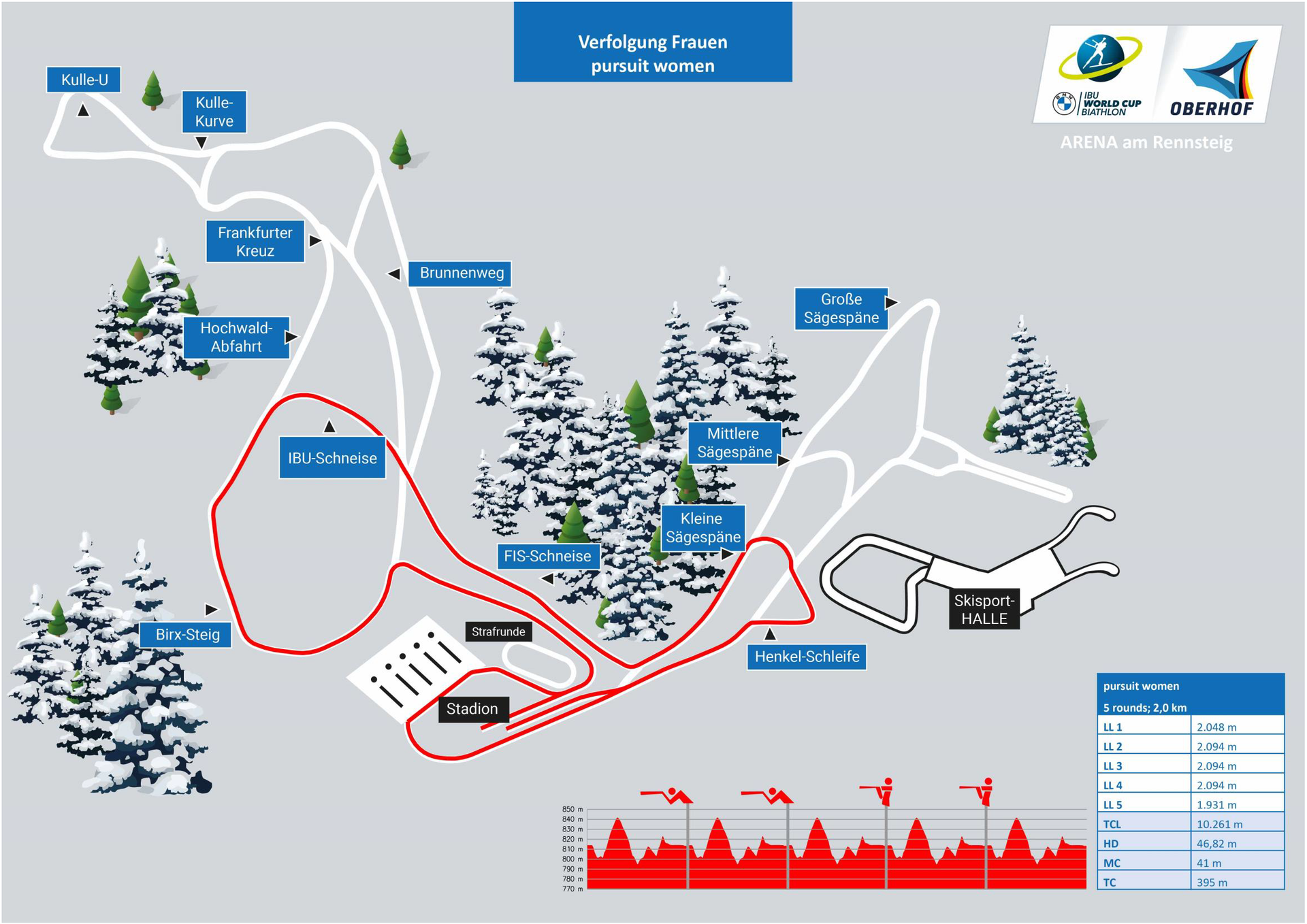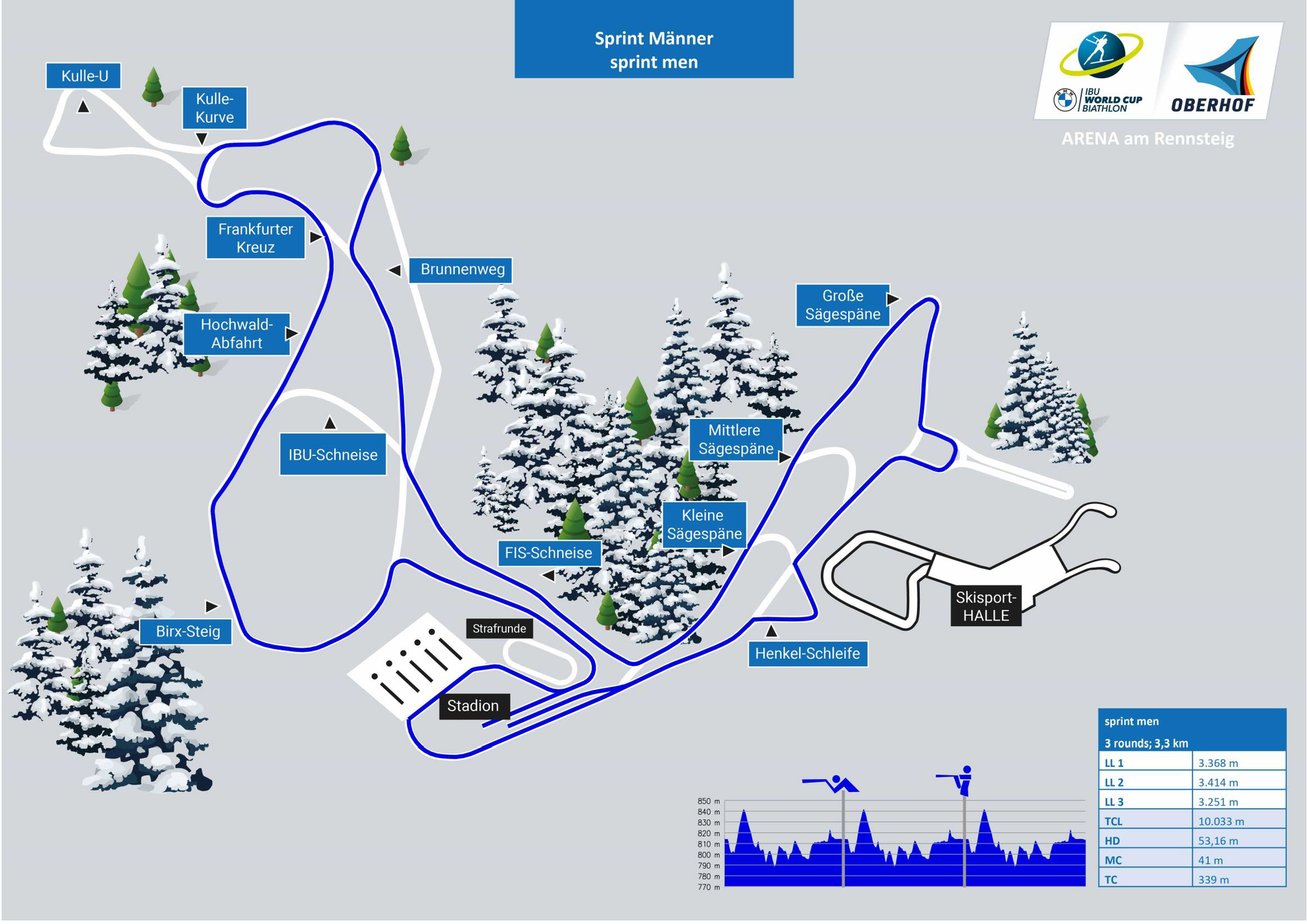The courses at the BMW IBU World Cup Biathlon 2026 in Oberhof are between 2 km and 3.3 km long. You can find out which routes the athletes run to the disciplines sprint, pursuit and relay in the overview as well as in the following track overviews.